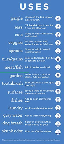 • It Works! The ultimate cleaner for 1st AID cuts and scrapes; BODY ears, throat and diffusers; HOUSEHOLD counters, surfaces, cutting boards, laundry, stains, toothbrush and baby gear; FOOD nuts, seeds, grains, veggies, fruit, meat, fish and chicken; PETS oral care and skunk odor; and PLANTS vase water and sprouts.